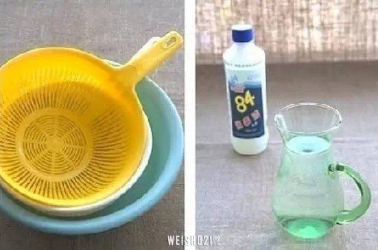 ▌將84消毒液和清水,以1:200的比例兌在一起,將需要“換膚”的塑料制品放入,浸泡兩個(gè)小時(shí)。再用清水反復(fù)沖洗干凈就可以了,效果好又不會(huì)產(chǎn)生任何腐蝕作用,浸泡過(guò)塑料框的水還可以倒入馬桶中,還能起到清潔馬桶的作用。