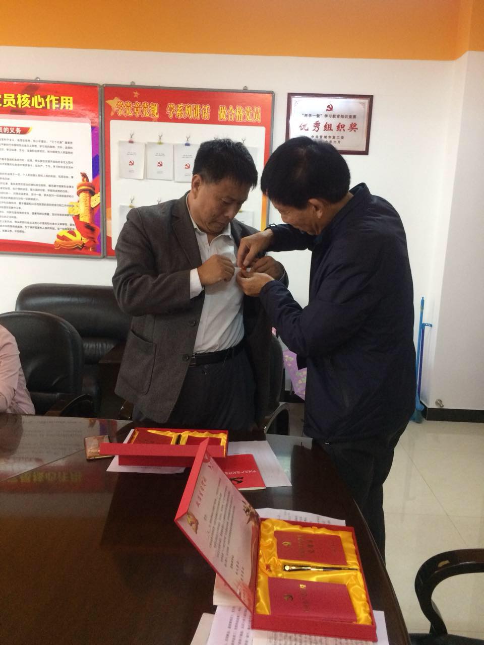 公司黨支部李書(shū)記為黨員佩戴黨徽、頒發(fā)政治生日盒及宣讀賀詞。
